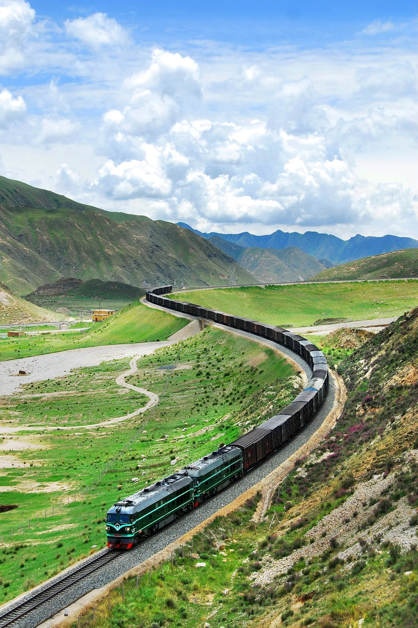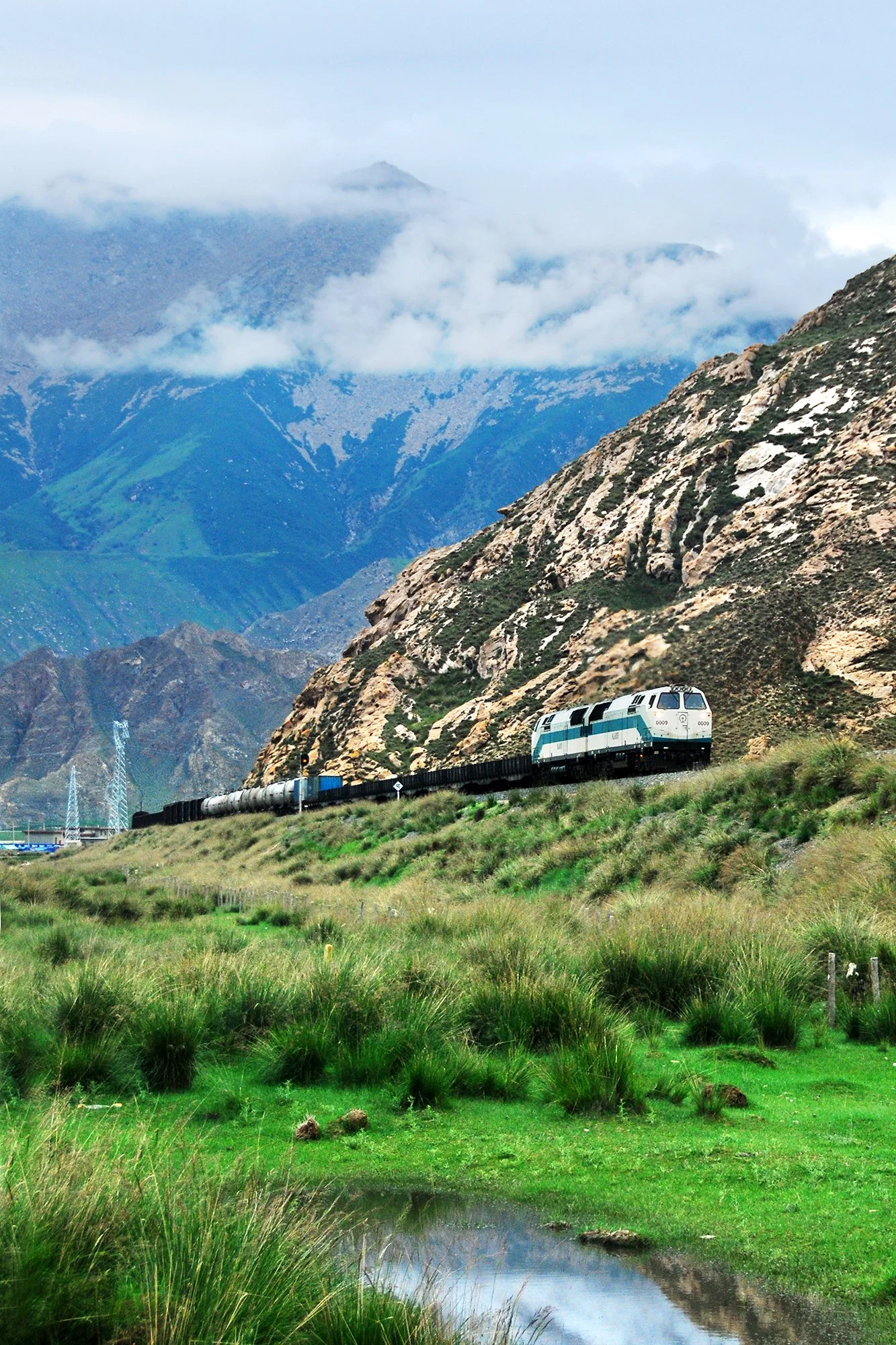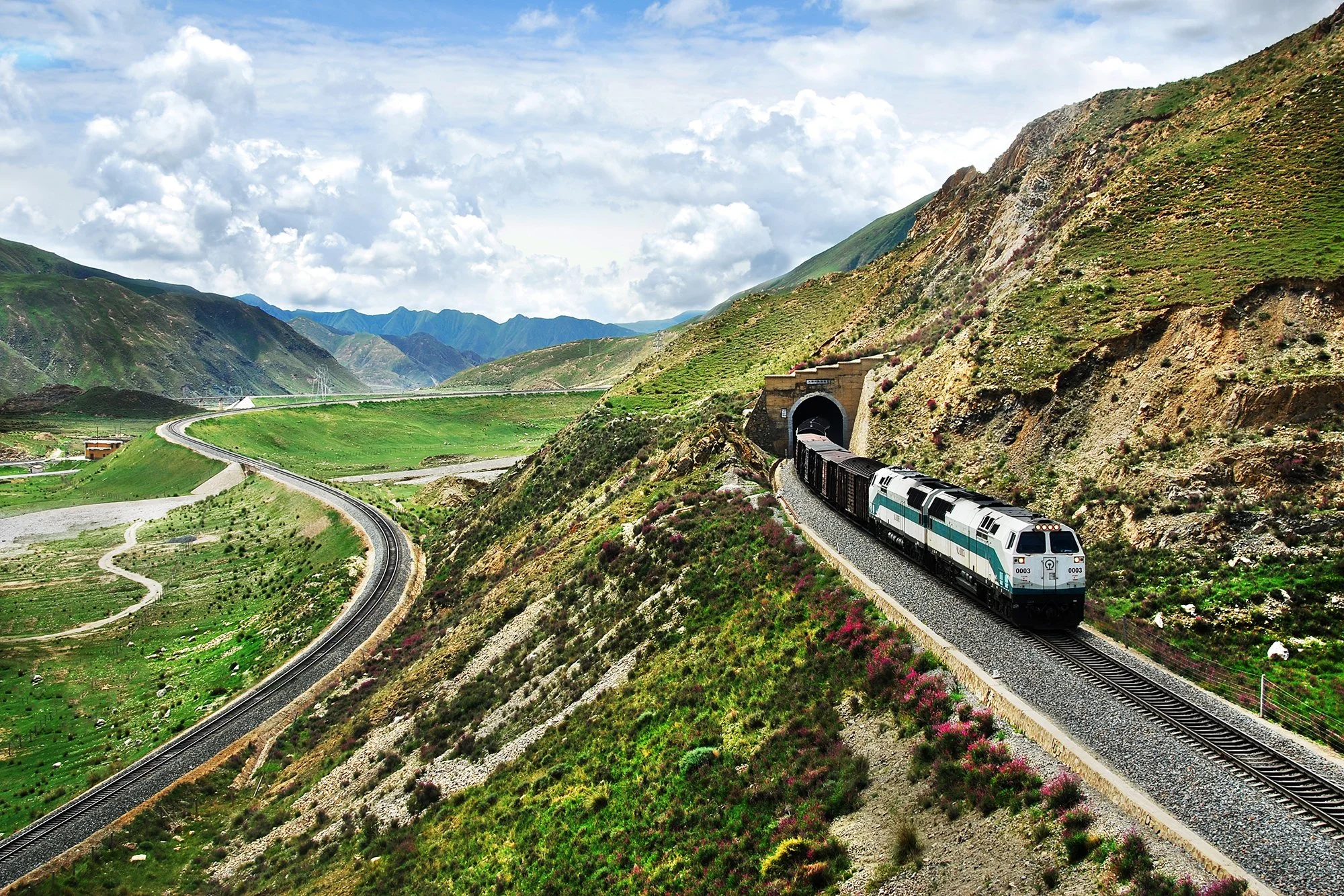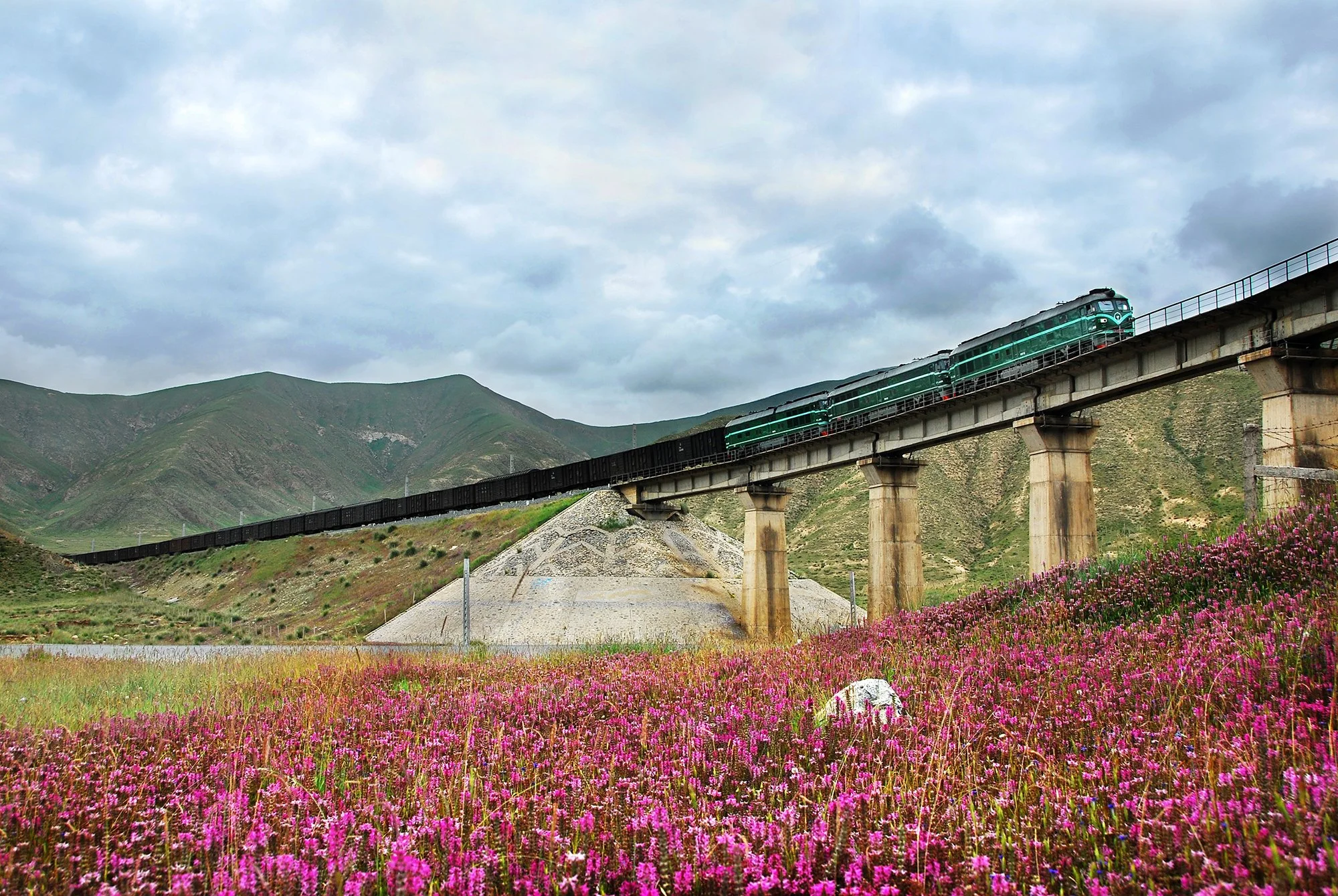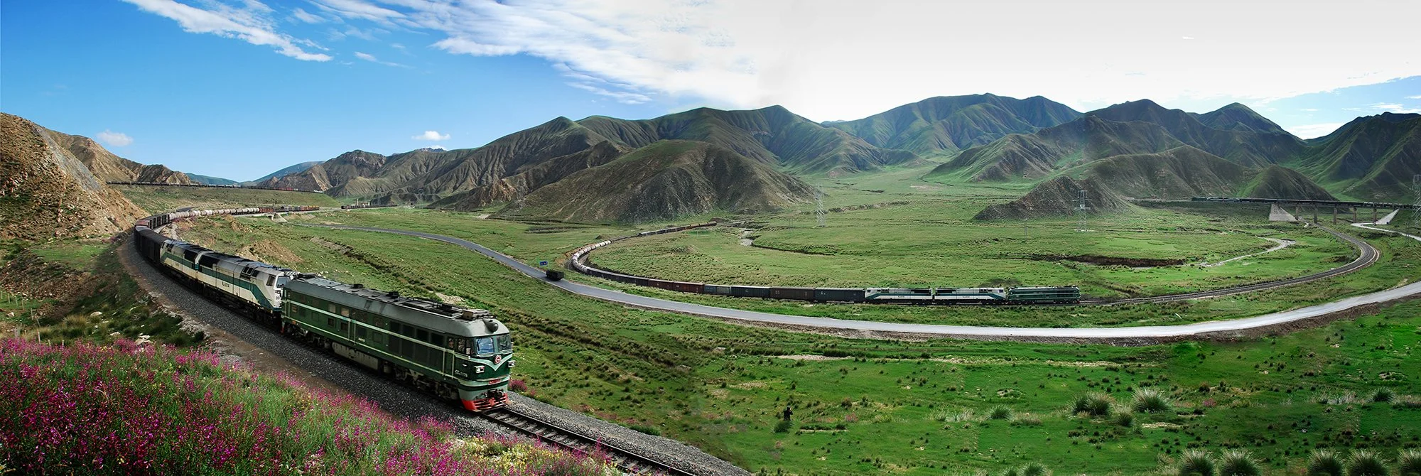 列車在花海中奮力爬坡,攝於關角隧道,2010年8月