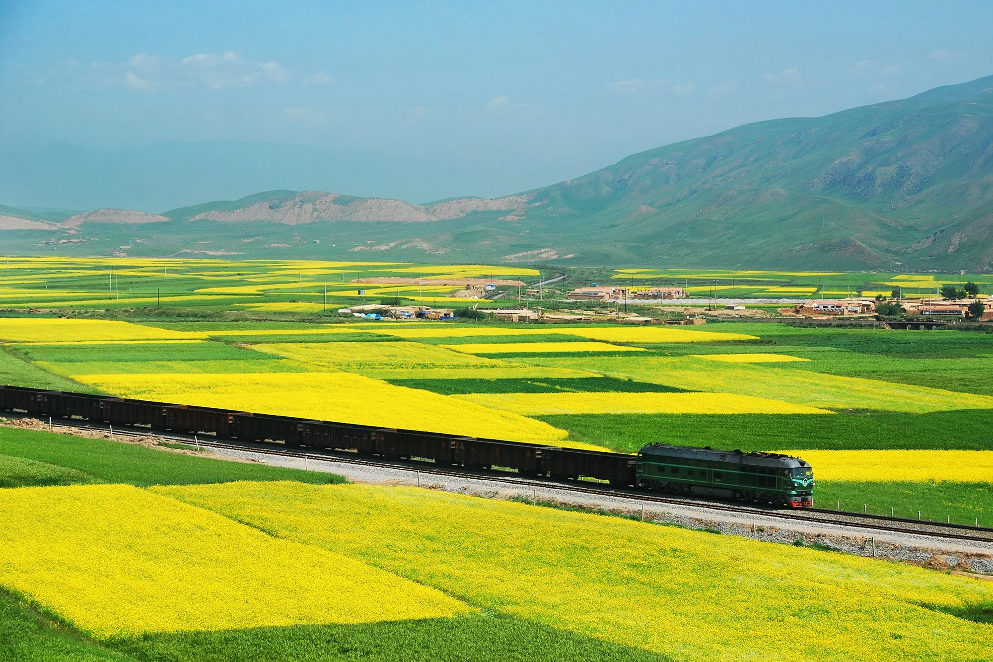 NJ2 型內燃機車駛入青藏鐵路黃草莊展線的油菜花海。2009年10月,這處展線被新建雙線鐵路取代,這處展線被廢除。