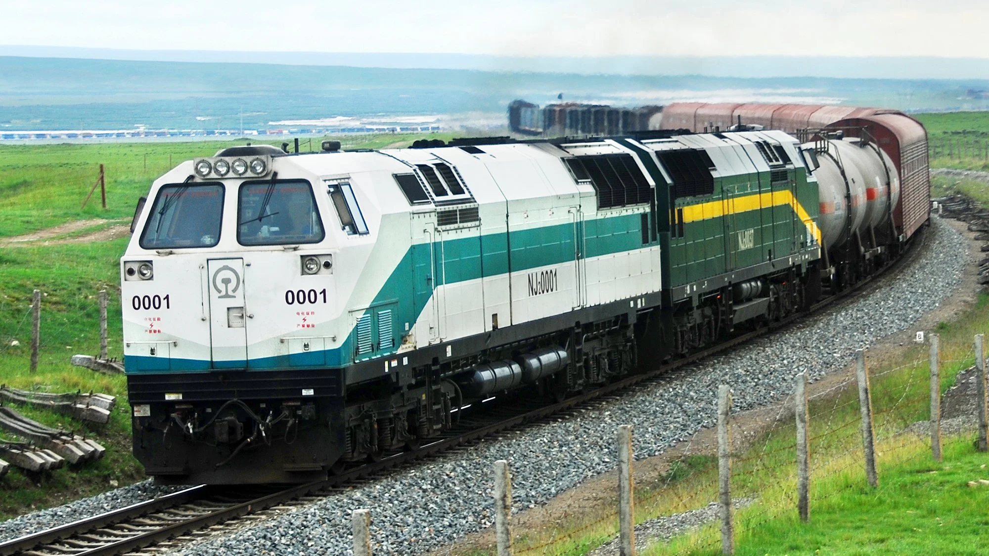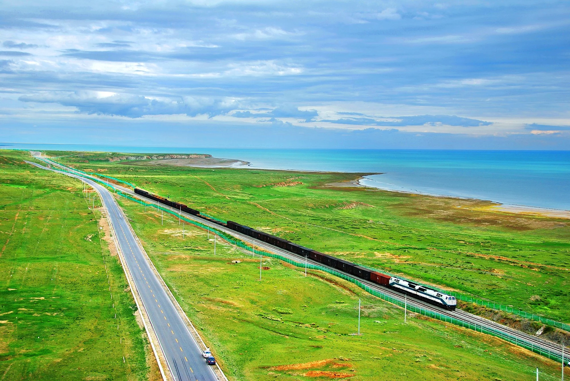圖為美國GE公司製造的NJ2型內燃機車牽引貨車運行於青海湖附近。