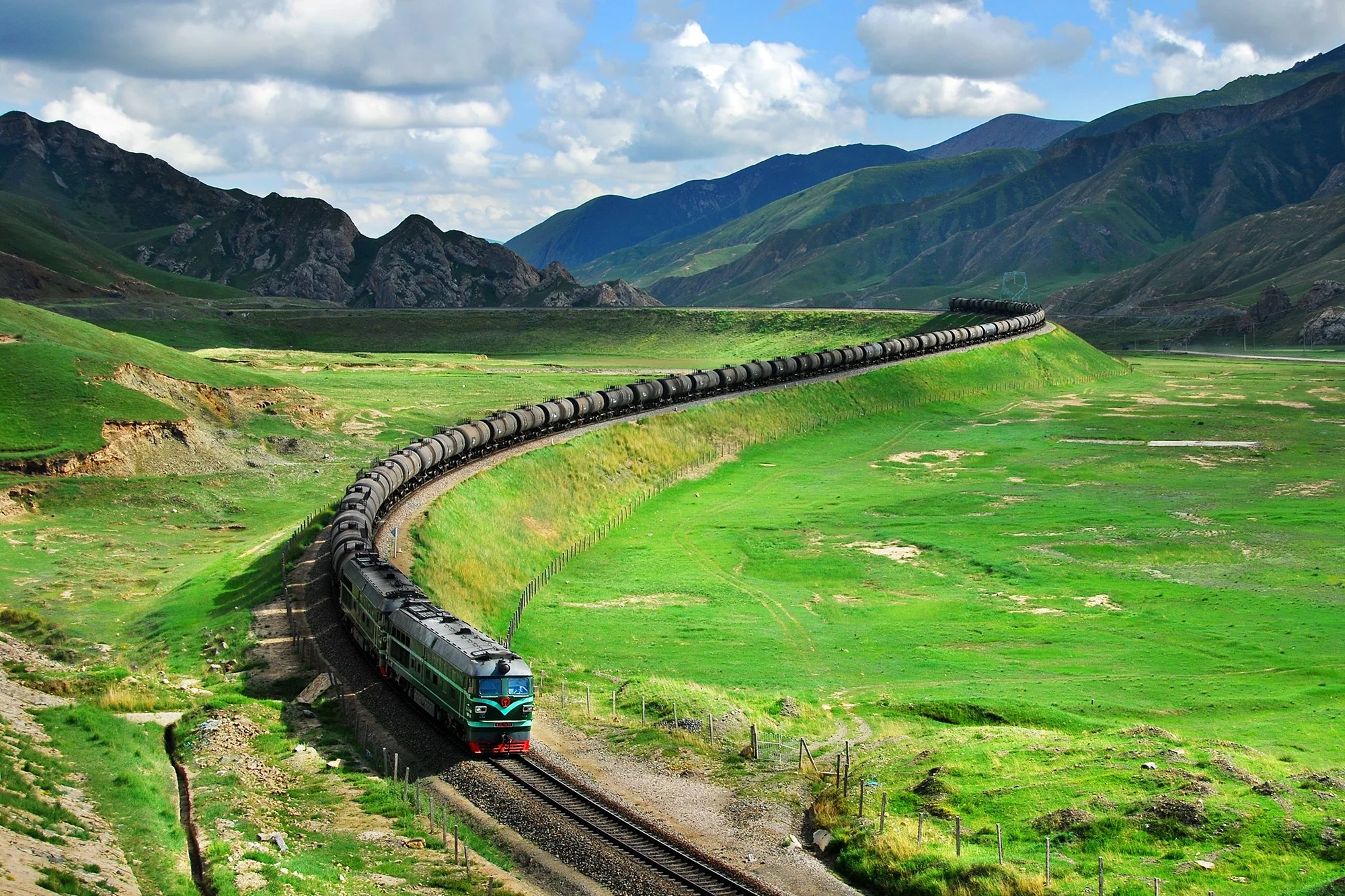 雙機東風 4 型內燃機車牽引油罐車大列下山。由於關角山展線的坡度較大,運行在這段的重載列車往往使用雙機牽引,攝於2009年7月。