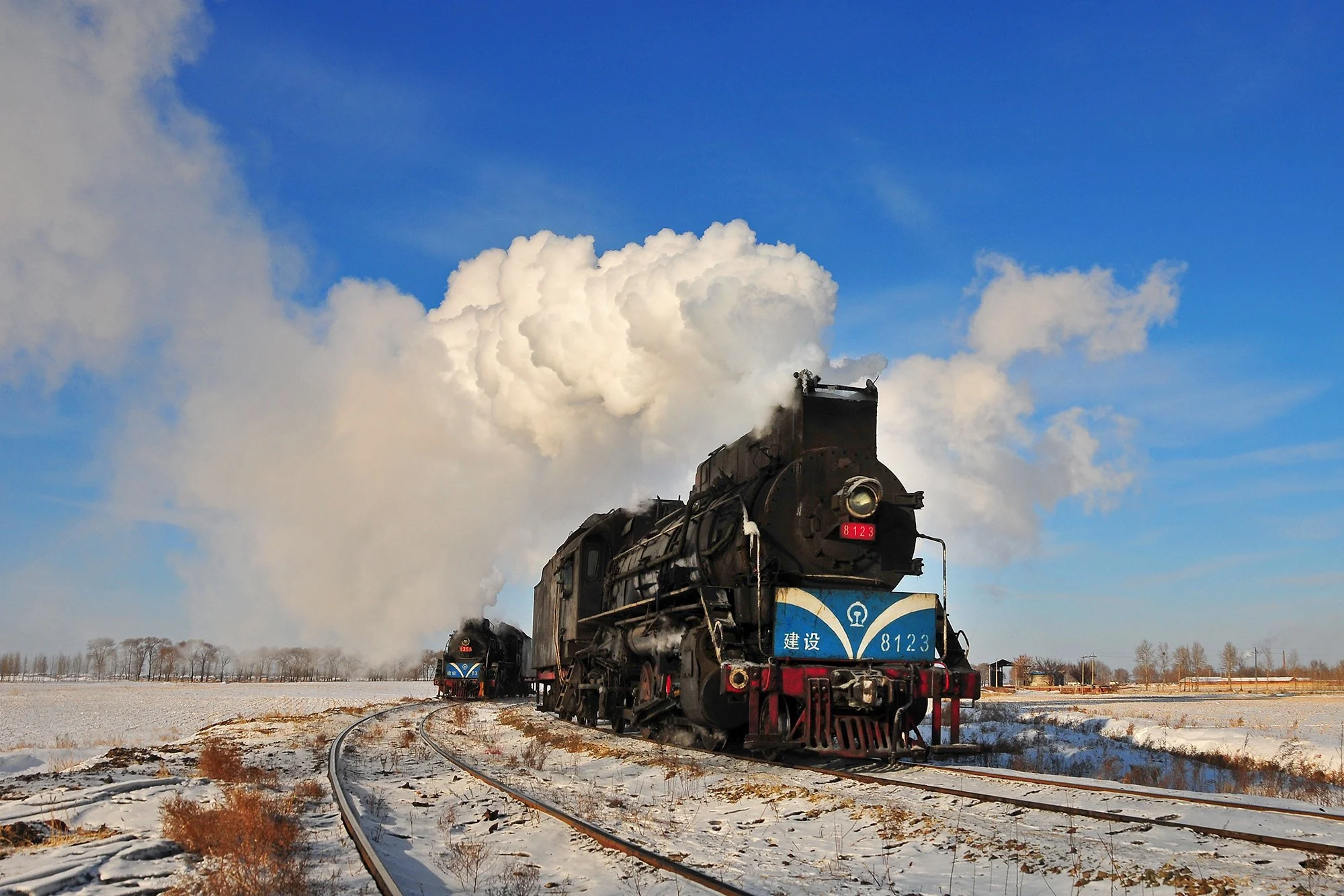 富拉爾基的2台建設型蒸汽機車交會,攝於2011年1月