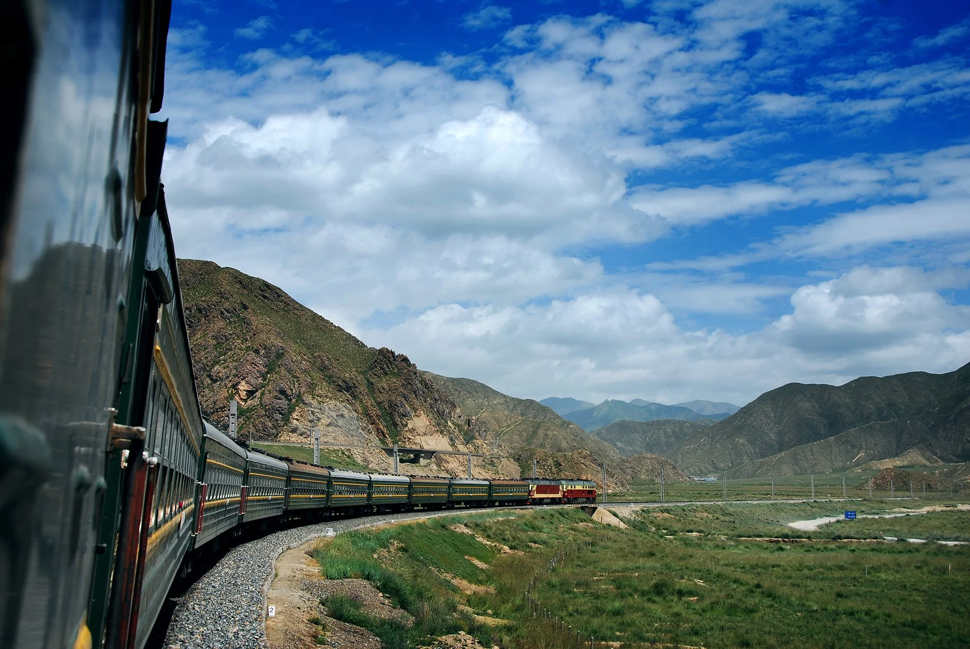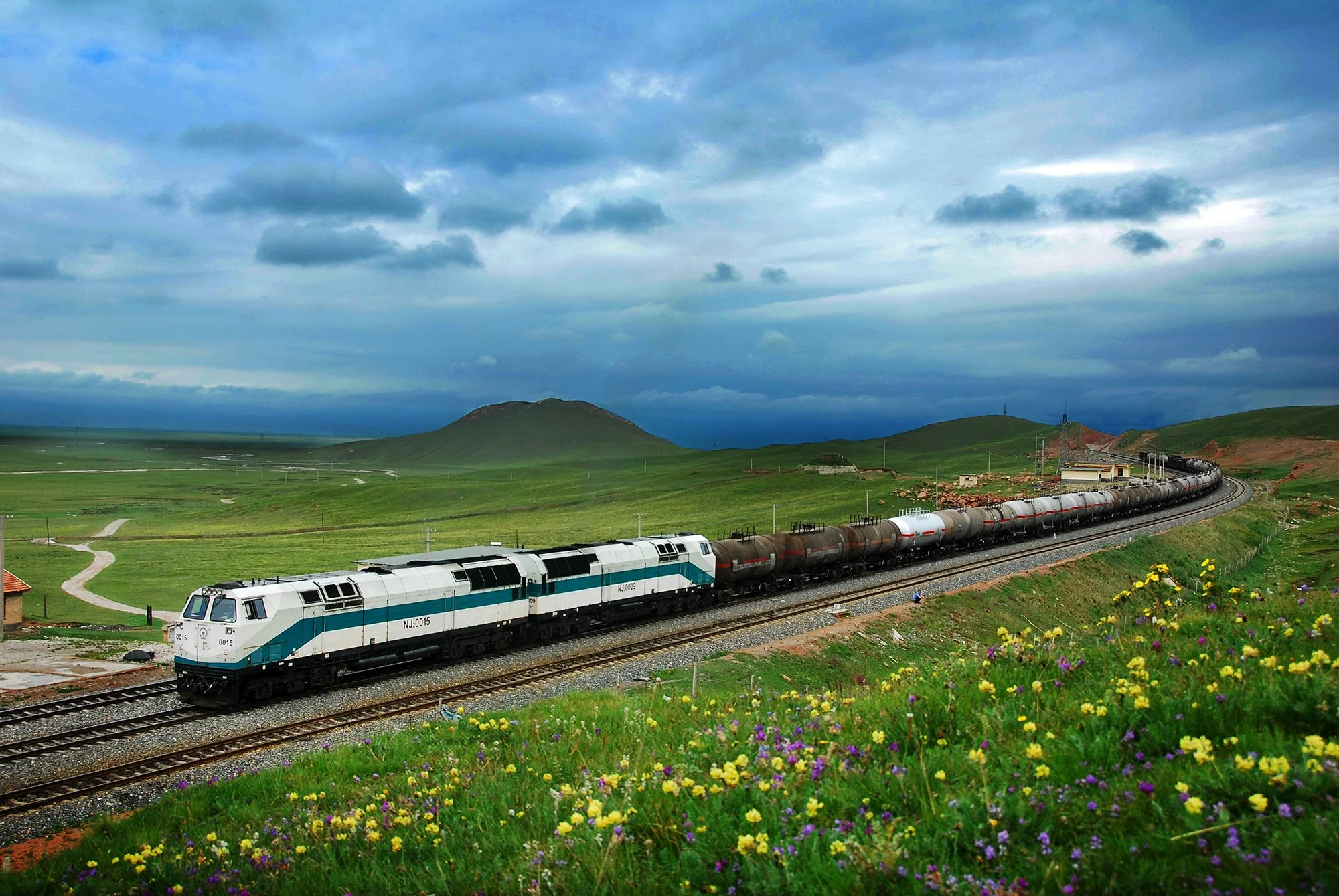 白色的NJ2-0001 號機車,這是第一台在青藏鐵路服役的 NJ2 型內燃機車。一年之後,這些白色的 NJ2 型內燃機車全部被改為綠色塗裝,攝於青藏鐵路鹿芒車站附近,2014年底,新關角隧道通車,這一段翻越關角山的鐵路被廢棄。