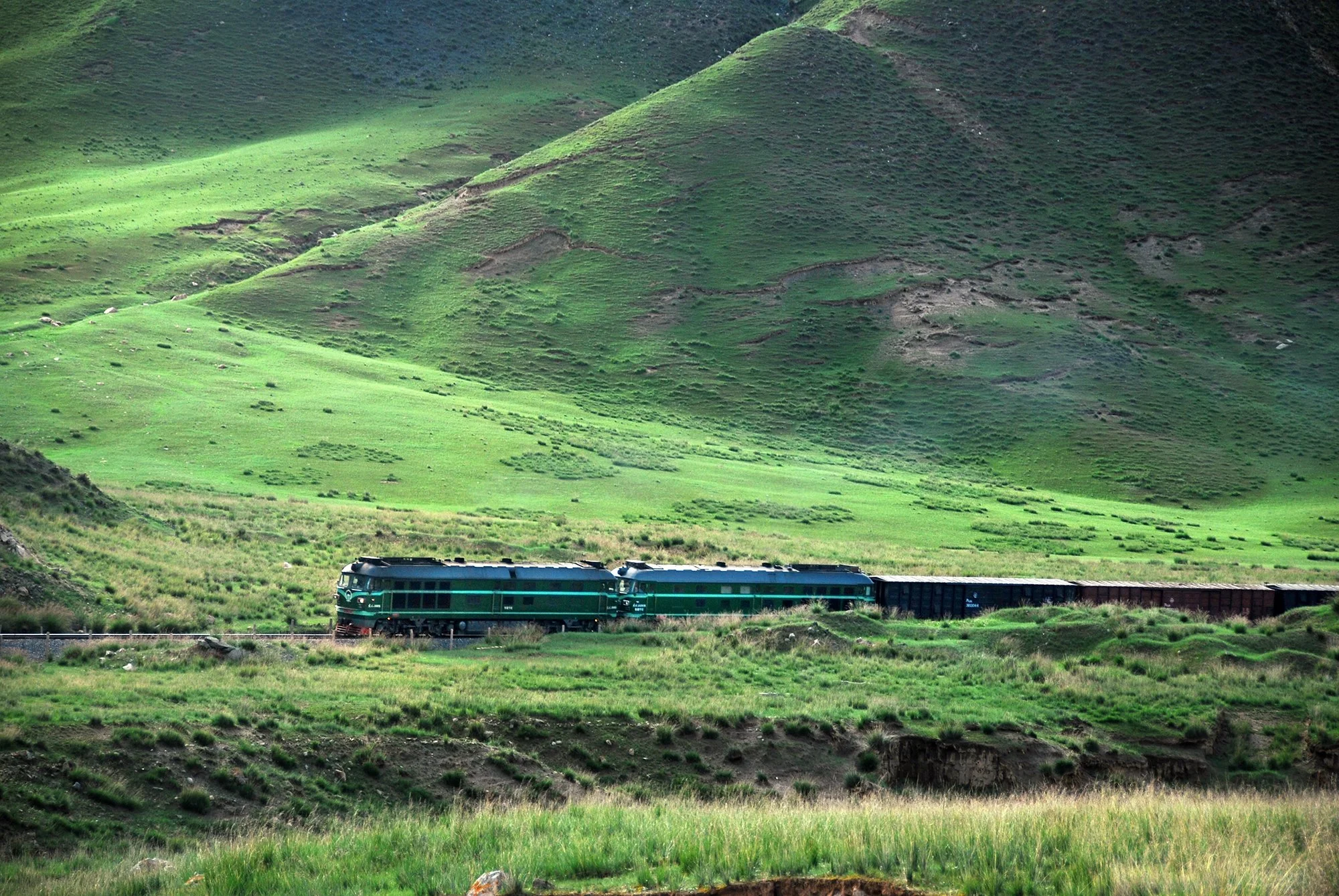 2009 年,關角山展線群最常見的就是東風 4 型內燃機車。這趟火車是從察汗諾出發的上行列車,柴油機聲震耳欲聾,但車速只有 30 多公里每小時,2011年,這裡的貨運機車被更換成電力機車。圖中遠處的路基是2014年年底通車的新線,攝於2009年7月。