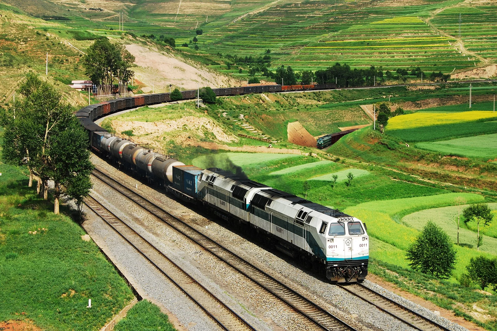 雙機東風 4 型內燃機車牽引貨車駛上洛北展線。筆者 2009 年來這裡時,線路旁還沒有立起接觸網電桿,