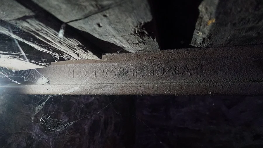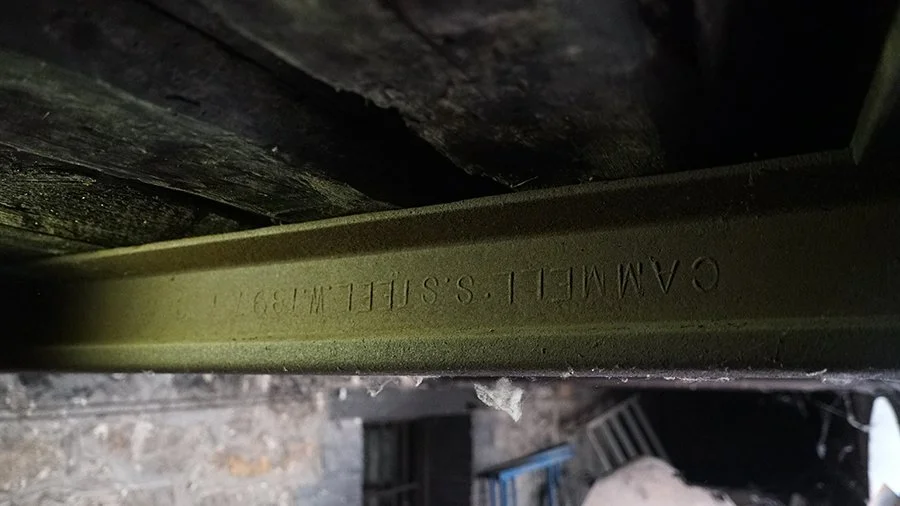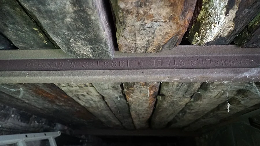 利用舊鋼軌製作的橫樑,位於半地下室。鋼軌銘文為CAMMELLS·STEEL·W 1896 I.C.R SEC 533。為英國CAMMELLS鋼廠與於1896年為官辦中國鐵路製造的鋼軌。2020年 王嵬 攝