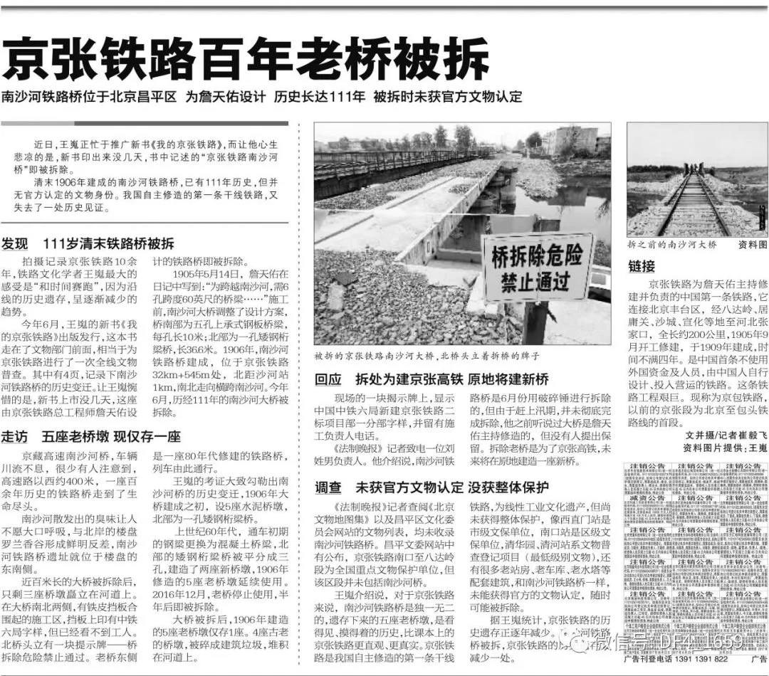 2017年,《法制晚報》曾曝光京張鐵路百年大橋被拆,被拆大橋沒有文物身份