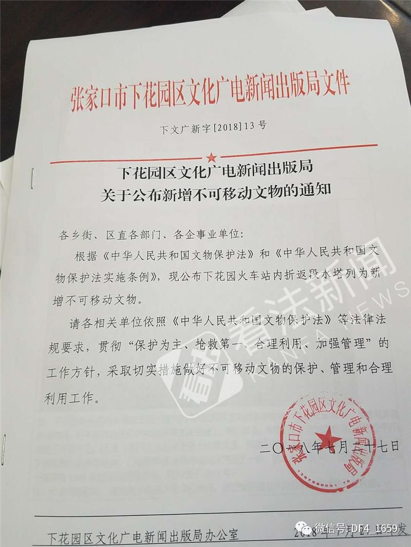 法制晚報·看法新聞記者注意到,7月27日,下花園區文化廣電新聞出版局辦公室印發《關於公布新增不可移動文物的通知》:根據《中華人民共和國文物保護法》和《中華人民共和國文物保護法實施條例》,公布下花園火車站內折返段水塔列為新增不可移動文物。請各相關單位採取切實措施做好不可移動文物的保護、管理、合理利用。
