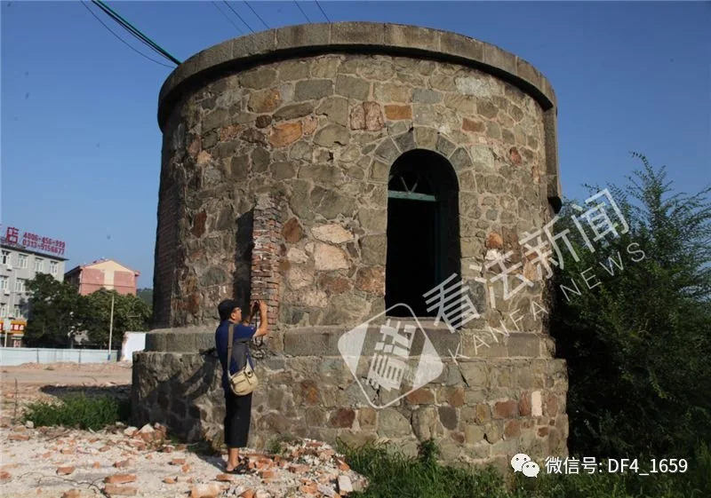 在一片剛剛完成拆遷的空地上,矗立著一座敦厚的圓柱形建築。塔基和塔身由毛石壘砌,塔基與塔身之間、及其塔頂,各鑲一圈斧剁石。水塔開大、小門各一,瘦高的券窗四扇,其中一扇被用紅磚封堵,其餘窗戶的木製窗框尚存,但玻璃已殘,水鶴的位置被封住。