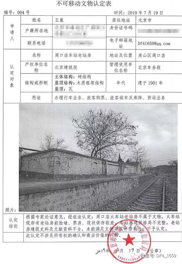 竇店車站和周口店車站,是房山區兩座百年歷史的火車站,今年2月1日,鐵路文化學者王嵬向當地文物部門遞交了兩份《不可移動文物認定申請表》,希望能為倖存的老站房爭取到文物身份。7月26日,王嵬收到官方“不予認定”的回覆,主要原因是歷史資料不全。