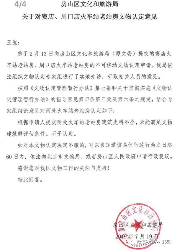 2019年7月19日,房山區文旅局對竇店站房、周口店車站遺存不予認定的回復