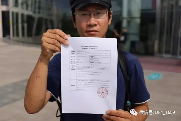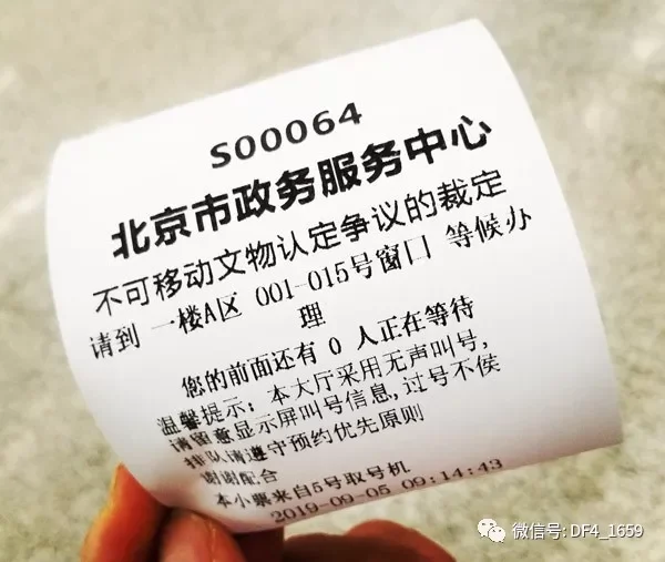 9月5日上午9點,北青報記者隨王嵬來到北京市政務服務中心,他將重新整理的15頁的複議材料遞交到綜合窗口,並收到一張蓋有北京市文物局行政審批服務處公章的《材料接收通知書》。通知書顯示申請事項為“不可移動文物認定爭議的裁定”,承諾受理時間為20個工作日(不含組織評審時限)。