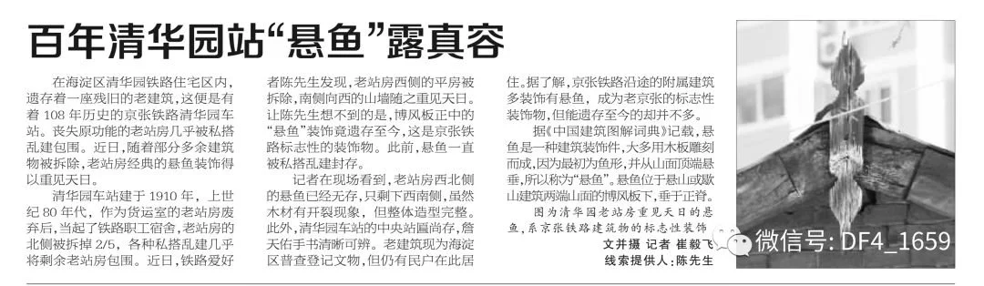 清華園車站建於1910年,上世紀80年代,作為貨運室的老站房廢棄後,當起了鐵路職工宿舍,老站房的北側被拆掉2/5,各種私搭亂建幾乎將剩餘老站房包圍。近日,鐵路愛好者陳先生發現,老站房西側的平房被拆除,南側向西的山牆隨之重見天日。讓陳先生想不到的是,博風板正中的“懸魚”裝飾竟遺存至今,這是京張鐵路標誌性的裝飾物。此前,懸魚一直被私搭亂建封存。《法制晚報》(微信ID:fzwb_52165216)記者在現場看到,老站房西北側的懸魚已經無存,只剩下西南側,雖然木材有開裂現象,但整體造型完整。此外,清華園車站的中央站匾尚存,詹天佑手書清晰可辨。老建築現為海淀區普查登記文物,但仍有民戶在此居住。據了解,京張鐵路沿途的附屬建築多裝飾有懸魚,成為老京張的標誌性裝飾物,但能遺存至今的卻並不多。據《中國建築圖解詞典》記載,懸魚是一種建築裝飾件,大多用木板雕刻而成,因為最初為魚形,並從山面頂端懸垂,所以稱為“懸魚”。懸魚位於懸山或歇山建築兩端山面的博風板下,垂於正脊。