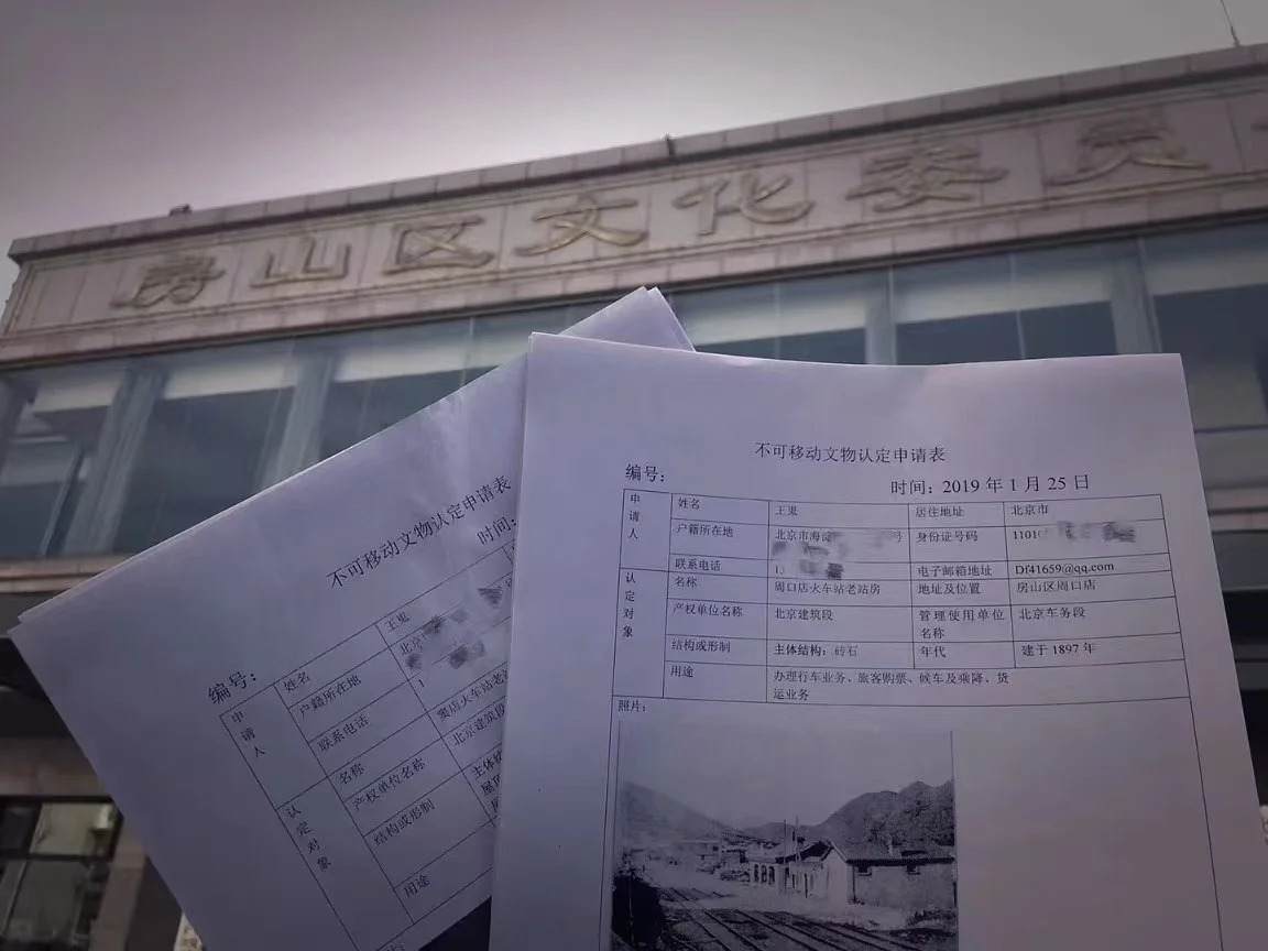 王嵬向房山區文物科遞交關於周口店站房遺存、竇店車站老站房的《不可移動文物認定申請》