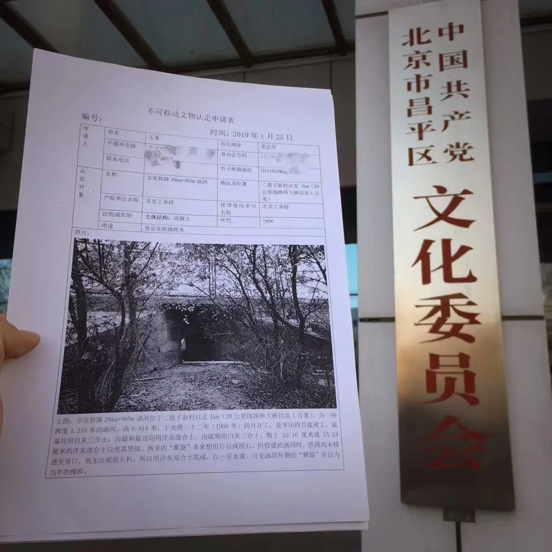 王嵬今天的最後一站是昌平區文化委員會,他就京張鐵路一處1906年修建的涵洞遞交文物認定申請。