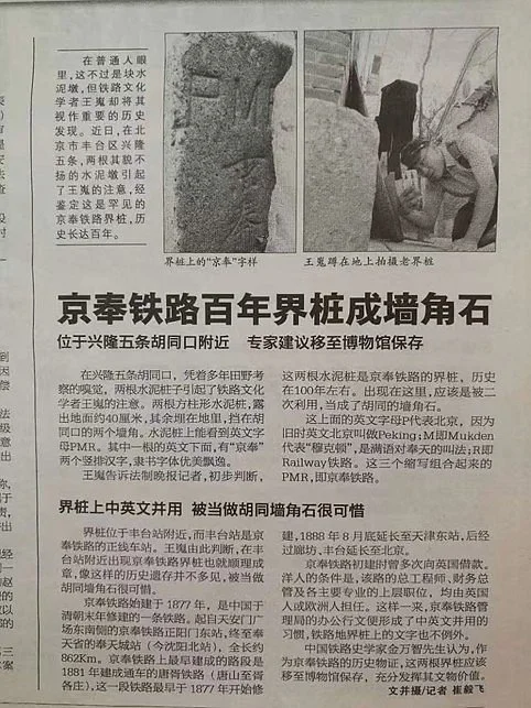 王嵬告訴法制晚報·看法新聞記者,初步判斷,這兩根水泥樁是京奉鐵路的界樁,歷史在100年左右。出現在這裡,應該是被二次利用,當成了胡同的牆角石。