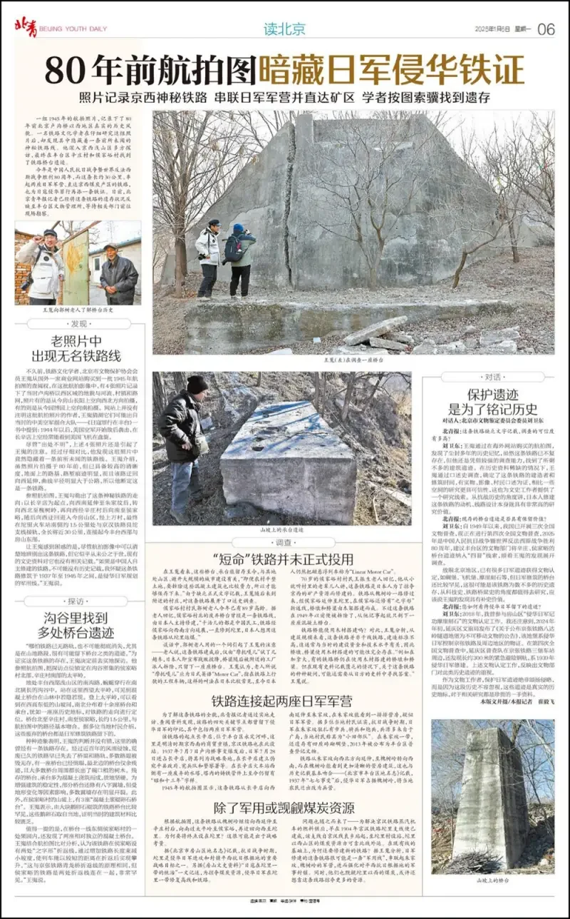一段塵封於老照片中的歷史痕跡,經民間學者實地探訪,揭開了一條侵華日軍的隱秘通道……近日,北京市文物保護協會會員、鐵路文化學者王嵬從一張81年前的航拍照片入手,發現京西曾建有一條神秘鐵路。儘管這條鐵路早已不存在,但按圖索驥的王嵬,在豐臺區張家墳村發現了一座混凝土橋。據當地村民介紹,此橋為軍用鐵路遺構,是侵華日軍為運輸武器彈藥而建。
