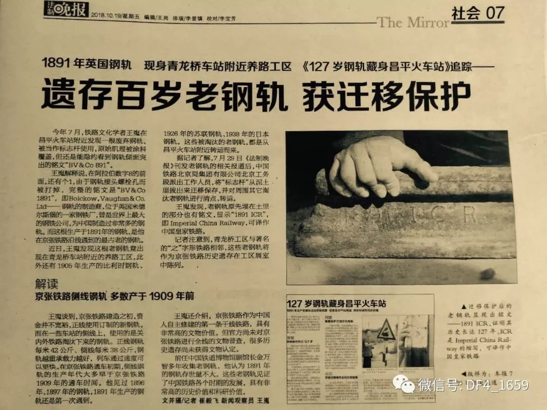 王嵬發現,老鋼軌原先埋在土裡的部分也有銘文,顯示“1891 ICR”,即Imperial China Railway,可譯作中國皇家鐵路。